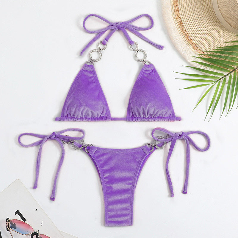 This velvet-look bikini in electric purple is dripping with sexy softness. Crystal ring detail brings the luxe.